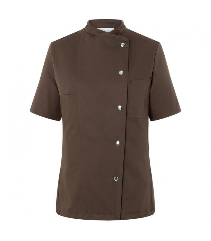 65% poliestere, 35% cotone. giacca da chef in tessuto rifinito, irrestringibile, vestibilitã aderente, pince sul petto, laterali anteriori e posteriori, maniche corte, taschino porta penne asimmetrico al petto, 5 bottoni a pressione, adatto per lavaggi industriali.