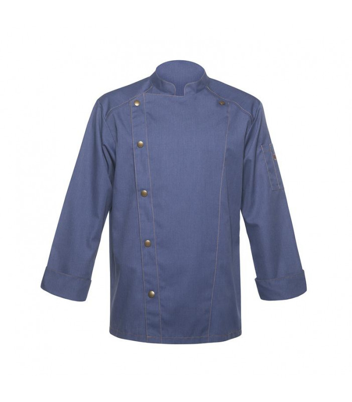 65% poliestere 35% cotone. giacca da chef in jeans, cuciture in contrasto, chiusura laterale (asimmetrica) con cinque bottoni, polsini delle maniche con spacchetti, tasca laterale sulla manica con compartimento per penna. adatta al lavaggio industriale.