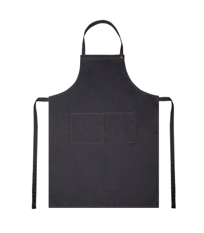 65% poliestere 35% cotone. grembiule di jeans con pettorina, doppie cuciture, cuciture in contrasto, cordino al collo regolabile con tre bottoni, tasca frontale (40 x 20 cm) con due comodi compartimenti (20 x 20 cm). adatto al lavaggio industriale. cordini in vita 112 cm l'uno.