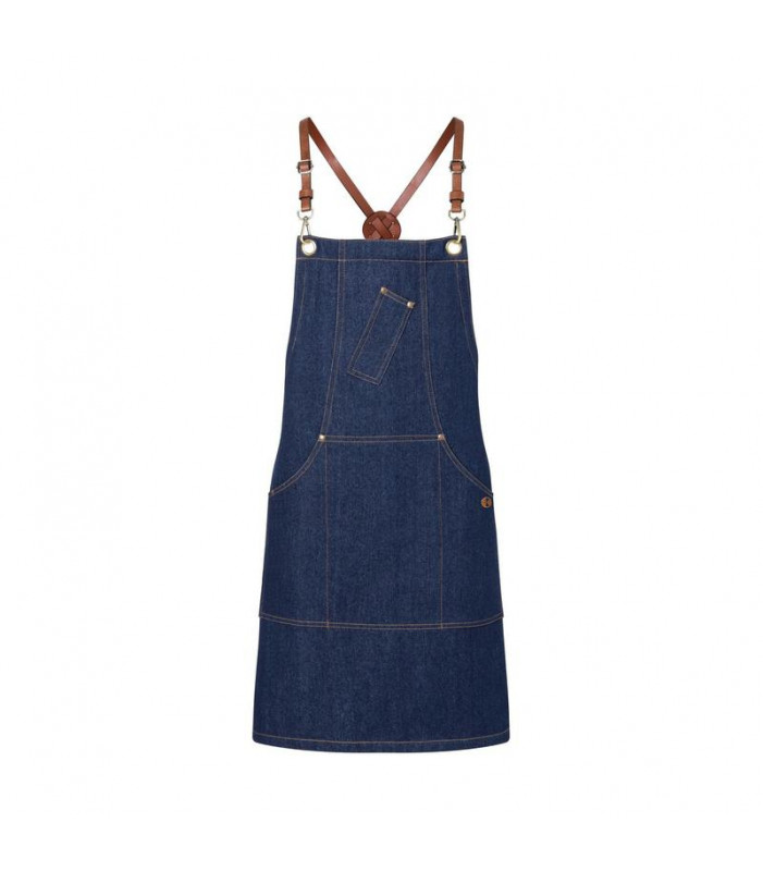 100% cotone. grembiule in denim con tasche. cinturini in pelle sintetica, removibili e regolabili in lunghezza. cinturino in tessuto a destra per attaccare una fondina o un asciugamano da cucina. lavabile fino a 60â° c.