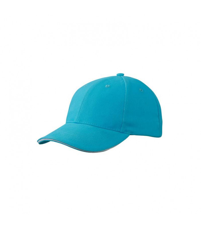 cap sandwich in molte combinazioni colore 6 fori traspiranti imbastiti, 6 cuciture decorative sulla visiera, pannelli frontali laminati. fascetta tergisudore imbottita in satin, chiusura in metallo a clip con asola imbastita, cotone spazzolato extra forte tessuto esterno: 100% cotone,