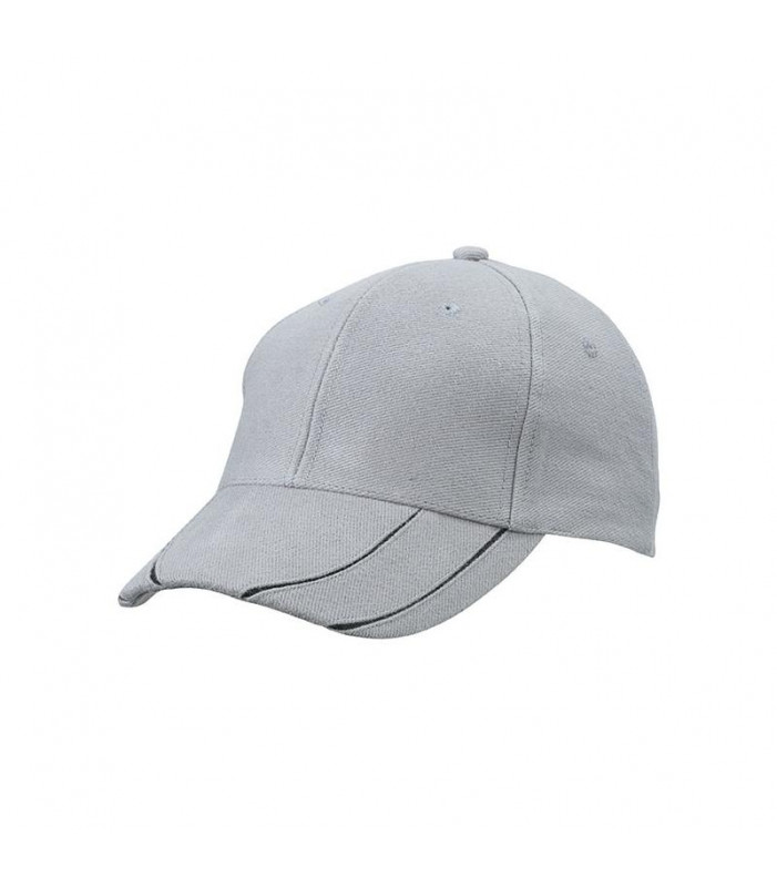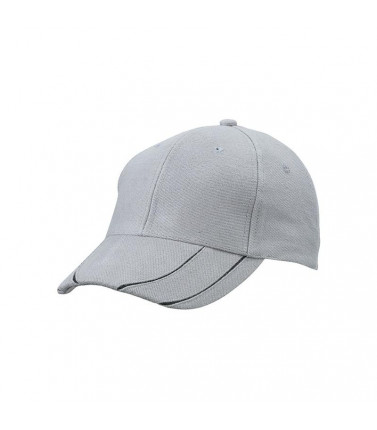 cappello a 6 pannelli ?chiusura a clip in metallo argentato con asola in stoffa. 6 fori imbastiti per la ventilazione, 4 strisce a contrasto dinamico sulla visiera, pannelli frontali laminati, fascetta antisudore imbottita in satin, cotone spazzolato resistente tessuto esterno: 100% cotone, ruvido, policromo, sandwich
