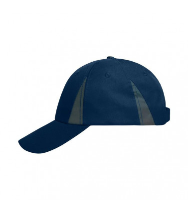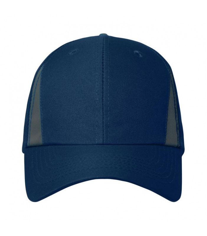 100% poliestere. safety cap con 4 fori di ventilazione ricamati, 6 cuciture decorative sulla visiera, inserti riflettenti sui pannellli, pannelli frontali laminati, chiusura in velcro, taglia unica.