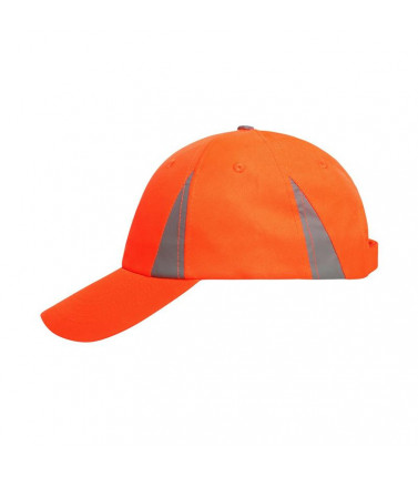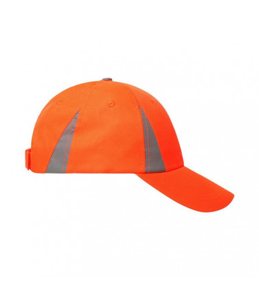 100% poliestere. safety cap con 4 fori di ventilazione ricamati, 6 cuciture decorative sulla visiera, inserti riflettenti sui pannellli, pannelli frontali laminati, chiusura in velcro, taglia unica.