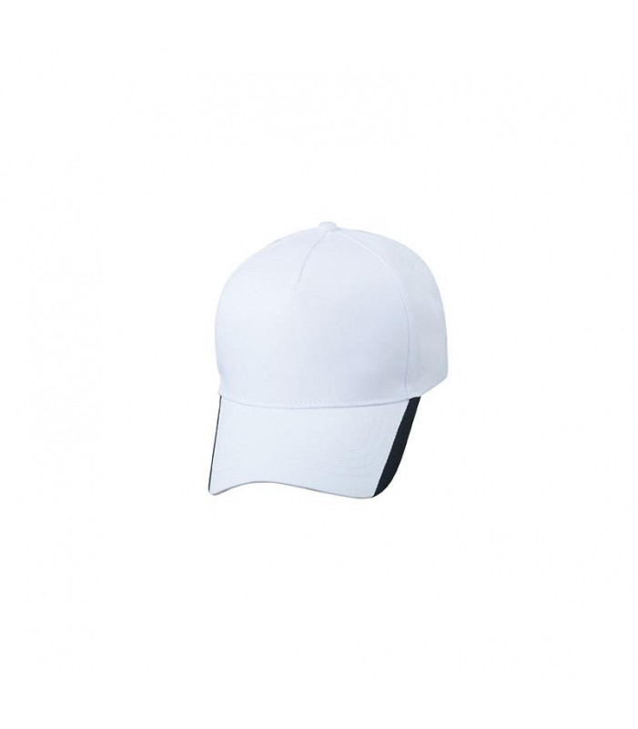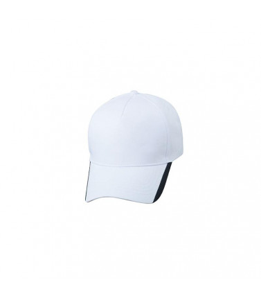 cappello a 5 pannelli con strisce contrastanti 4 fori di aerazione ricamati, 4 cuciture decorative sulla visiera, pannello frontale laminato, fascetta tergisudore imbottita in satin, chiusura a velcro tessuto esterno: 100% cotone, velcro, policromo, sandwich