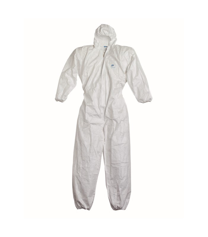 Chiusura con cerniera centrale, elastico ai polsi, in vita e al fondo gamba, con cappuccio 100% polietilene, peso 41 g/m2