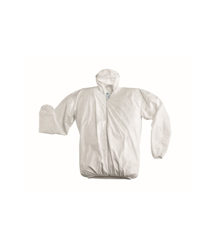 Chiusura con cerniera centrale, elastico ai polsi e in vita, con cappuccio 100% polietilene microforato, peso 41 g/m2