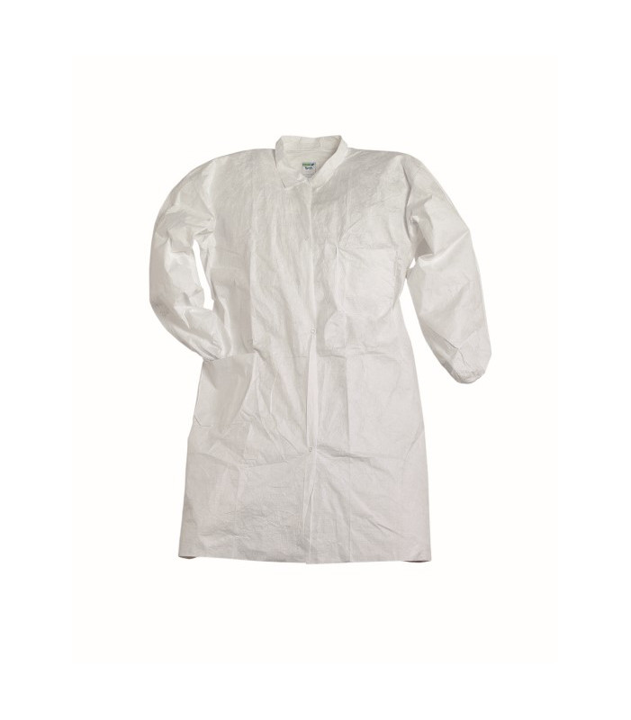 Chiusura con bottoni automatici, 1 tasca e 1 taschino, elastico ai polsi 100% polietilene microforato, peso 41 g/m2