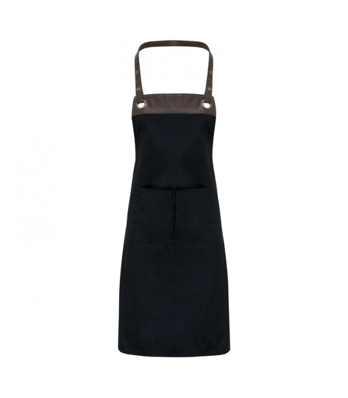 65% poliestere, 35% cotone con rifiniture in ecopelle. grembiule taglia unica con girocollo in ecopelle, bottoni a pressione sul collo, occhielli in metallo, due pratiche tasche di 13 cm.