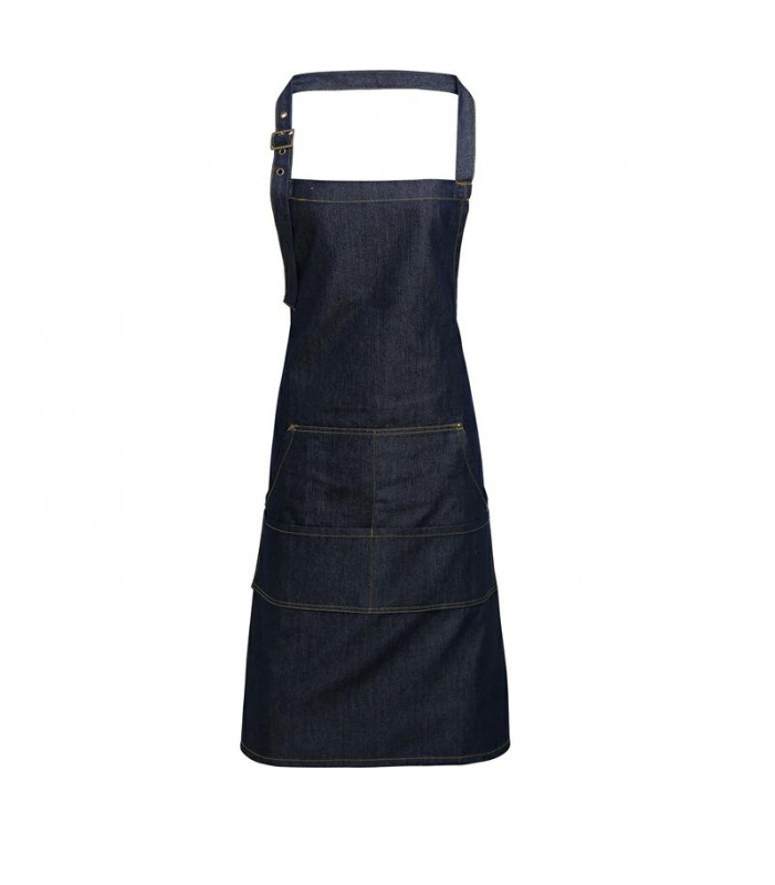 70% cotone, 30% twill di poliestere. grembiule in denim, cuciture a contrasto, inserti in rame, quattro tasche, fibbia per regolare il collo. 265 g/m²