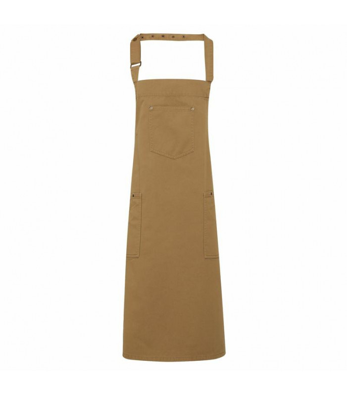 100% cotone. grembiule con pettorina e grande tasca frontale con rivetti e cuciture, due tasche laterali, cordoncino al collo regolabile e fermabile con bottone a pressione. lavabile a 60 â°c.