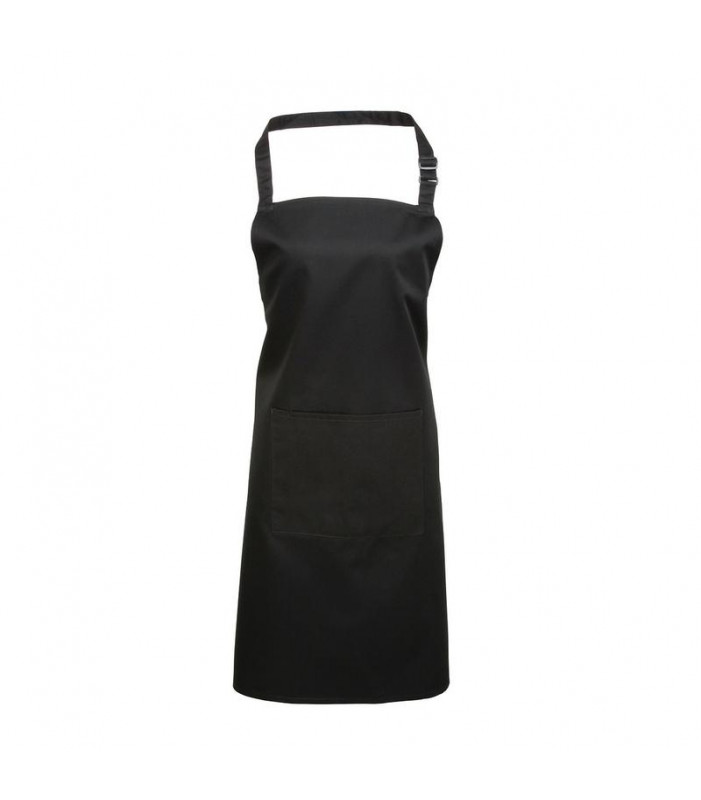 grembiule con pettorina 65% poliestere, 35% cotone con tasca centrale e una tasca per penna separata, laccio collo regolabile con fibbia.