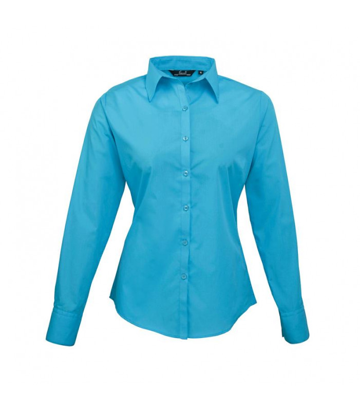 camicia manica lunga in popeline, 65% poliestere, 35% cotone, finiture con pieghe sul retro e sul davanti per un taglio piu' aderente, colletto morbido, due bottoni sui polsini, .