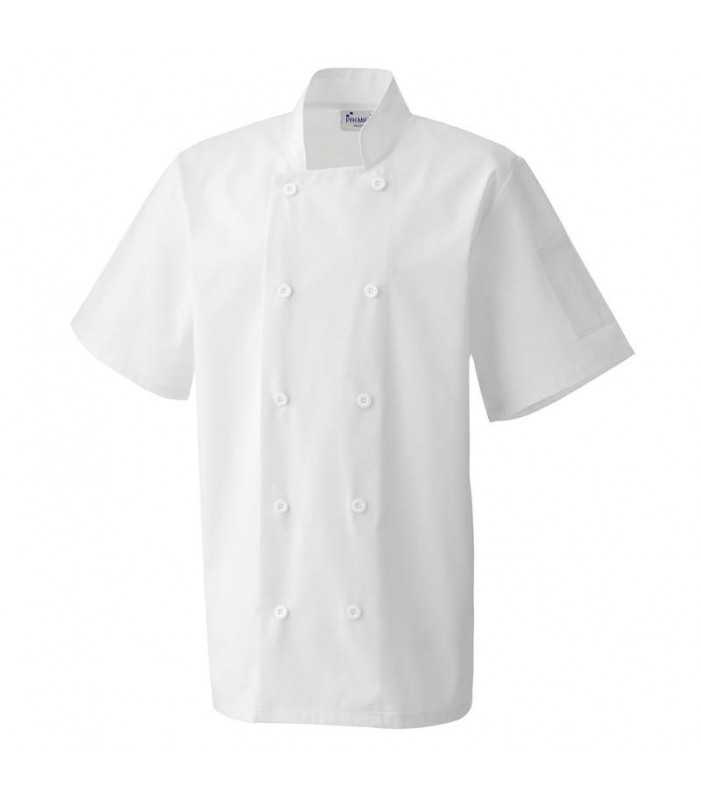 65% poliestere, 35% cotone twill. giacca da chef unisex a manica corta, chiusura con dieci bottoni in resina di alta qualità, tessuto facile da trattare e molto resistente, sulla manica sinistra comoda tasca porta penna. 195 g/m²