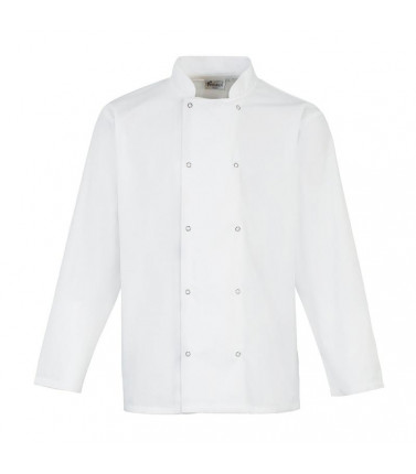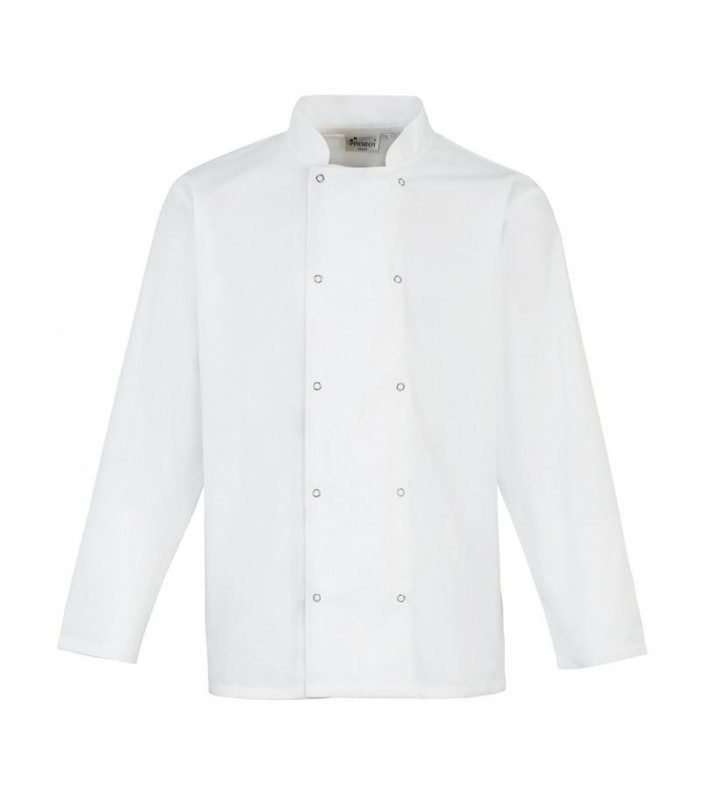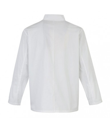 65% poliestere, 35% cotone twill. tessuto morbido al tatto specificamente progettato per il comfort dell'utente, collo alla coreana con impunture, manica lunga, bottoni a pressione, stile unisex. 195 g/m²