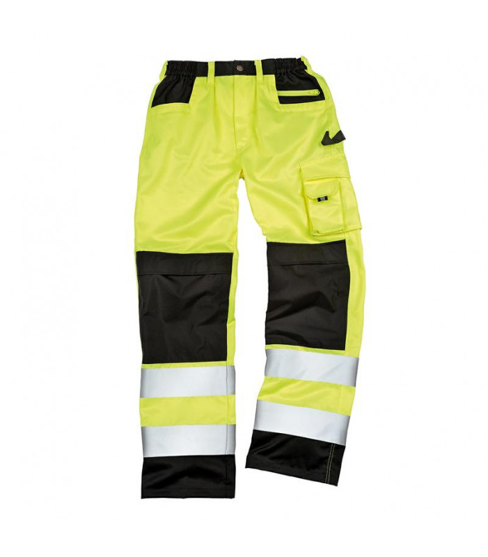 80% poliestere 20% cotone twill. girovita leggermente elasticizzato con passanti, zip frontale con bottone, tasche posteriori, spacco e zip su tasche frontali, pannelli a contrasto neri, rinforzi sui punti di stress, bande riflettenti sulla gamba, tasca l
