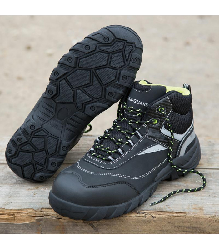 tomaia in pelle nabuk e rete, intersuola in kevlar, suola in eva/gomma (etilene vinil acetat) e puntale in acciaio. proprietà antiscivolo e antistatiche, dettagli riflettenti, caviglia e linguetta imbottita, calzatura solida e resistente.