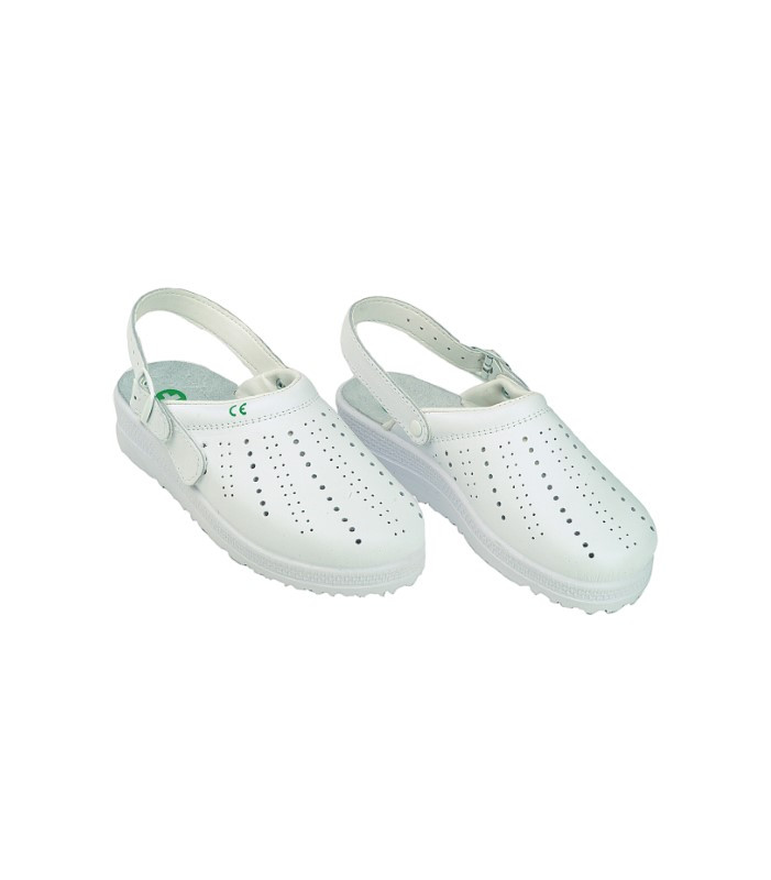 Zoccolo in pelle forata traspirante colore bianco, imbottitura confortevole al collo del piede, suola in poliuretano antiscivolo e antistatica con assorbimento di energia nel tallone, sottopiede in pelle e struttura anatomica, cinturino retraibile dal collo del piede al tallone.