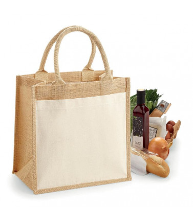100% cotone. shopper multiuso in juta laminata con tasca frontale in tela. lunghezza manici: 40 cm. dimensioni: 30 x 30 x 19 cm, capacita': 14 litri, area stampabile: 25 x 20 cm.