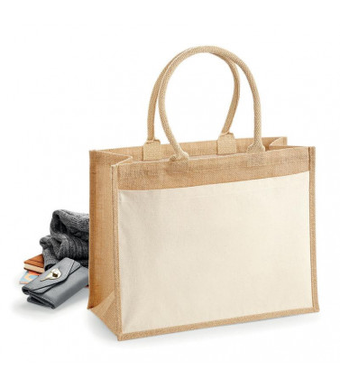 100% cotone. shopper multiuso in juta laminata con tasca frontale in tela. dimensioni: 42 x 33 x 19 cm, lunghezza manici: 55 cm, capacita': 21 litri, area stampabile: 36 x 22 cm.