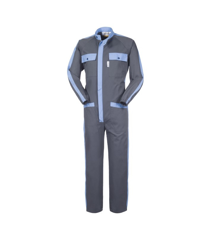 Chiusura con cerniera centrale coperta, elastico in vita posteriore, striscia di colore a contrasto su spalle, maniche, bordo tasche, alette taschini, collo, copricerniera e gambe, 2 tasche anteriori applicate, 2 taschini al petto chiusi con aletta e bottone, elastico ai polsi gabardine, 65%poliestere 35% cotone, peso 245 g/m2