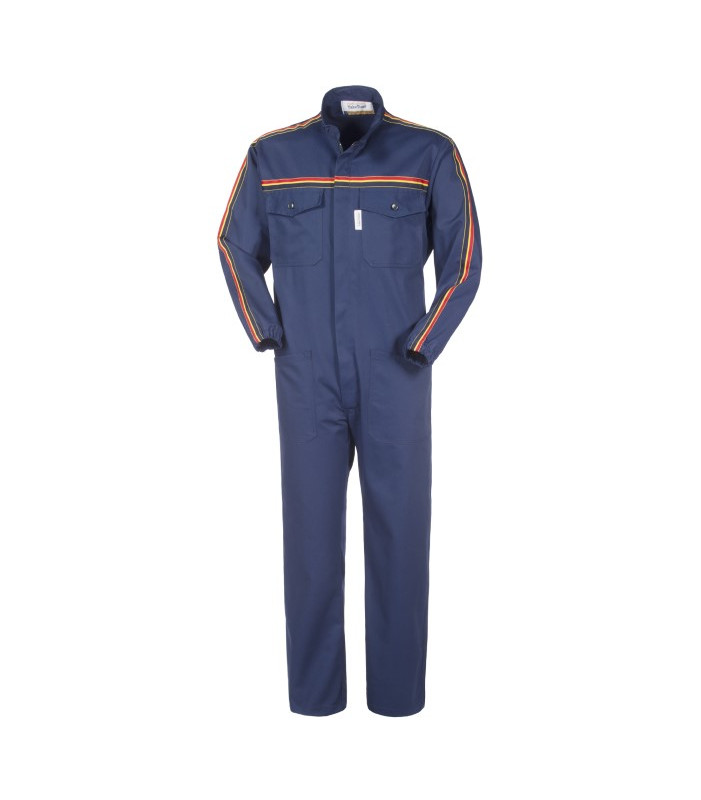 Chiusura con cerniera centrale coperta, elastico in vita posteriore, striscia tricolore su spalle, maniche e petto, collo alla coreana chiuso con un bottone, 2 tasche anteriori applicate, 2 taschini applicati al petto chiusi con aletta e bottone, elastico ai polsi gabardine, 65% poliestere 35% cotone, peso 245 g/m2