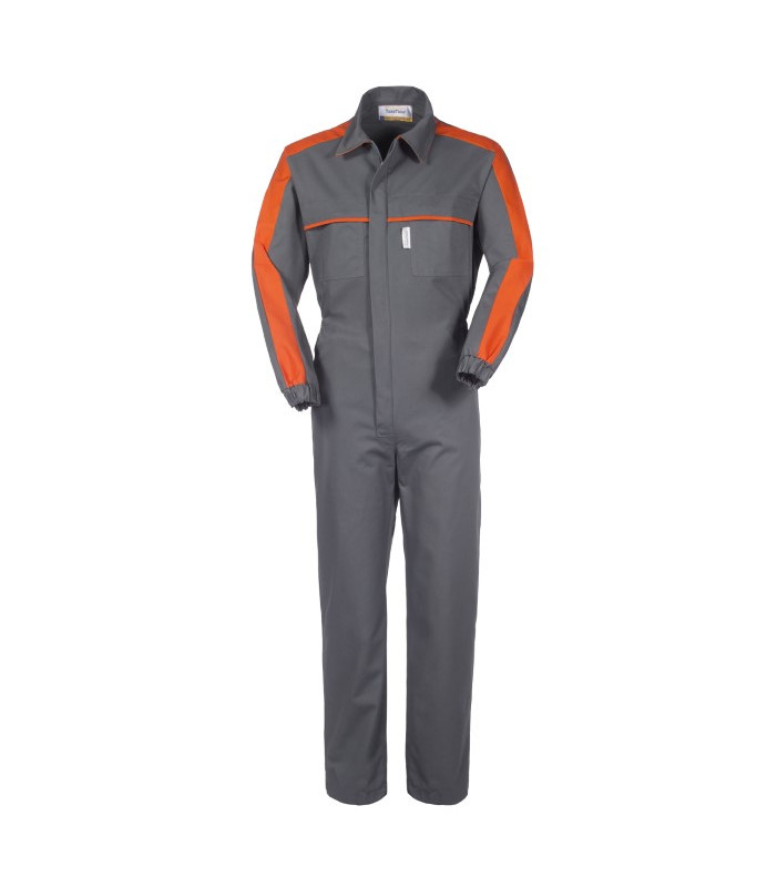 Chiusura con cerniera centrale coperta, elastico in vita posteriore, inserti su spalle e maniche e profilo al petto di colore arancio, collo a camicia con sottocollo di colore arancio, 2 tasche anteriori interne chiuse con punto di velcro, 2 taschini al petto applicati chiusi con cerniera coperta da aletta, elastico ai polsi gabardine, 65% poliestere 35% cotone peso 245 g/m2