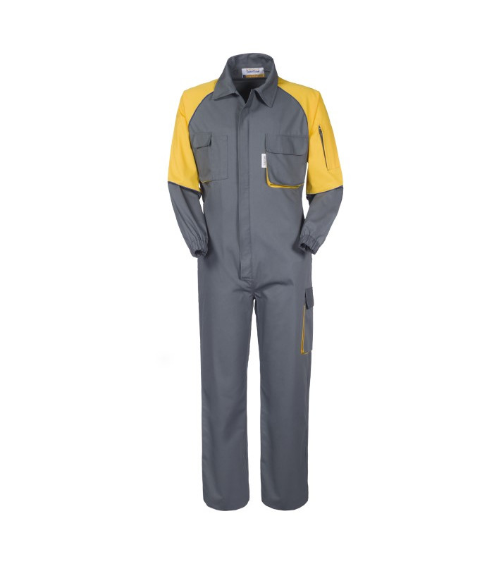 Chiusura con cerniera centrale coperta, elastico in vita posteriore, profilo blu rifrangente inserito nella cucitura delle maniche a raglan, collo a camicia, 2 tasche anteriori interne chiuse con punto di velcro, 1 tascone applicato su gamba sinistra con soffietto laterale di colore giallo chiuso con aletta e velcro, 1 taschino applicato al petto sinistro con soffietto laterale di colore giallo chiuso con aletta e velcro, 1 taschino porta cellulare applicato al petto destro con soffietto laterale di colore giallo chiuso con aletta e velcro, tasca portapenne applicata al petto destro, 1 taschino applicato alla manica sinistra chiuso con cerniera, elastico ai polsi gabardine, 65% poliestere 35% cotone, peso 245 g/m2