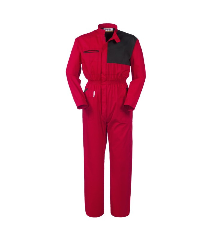 Chiusura con cerniera centrale coperta e punti di velcro, elastico al girovita, carrè posteriore di colore nero, parte del petto sinistro di colore nero con cuciture nere a quadri, petto destro di colore rosso con cuciture a quadri di colore nero, collo alla coreana chiuso con velcro, 2 tasche inferiori applicate con profilo di colore nero e cuciture a quadri di colore nero, 1 taschino a filetto al petto destro con profilo di colore nero, polsi chiusi con velcro gabardine, 65% poliestere 35% cotone peso 245 g/m2