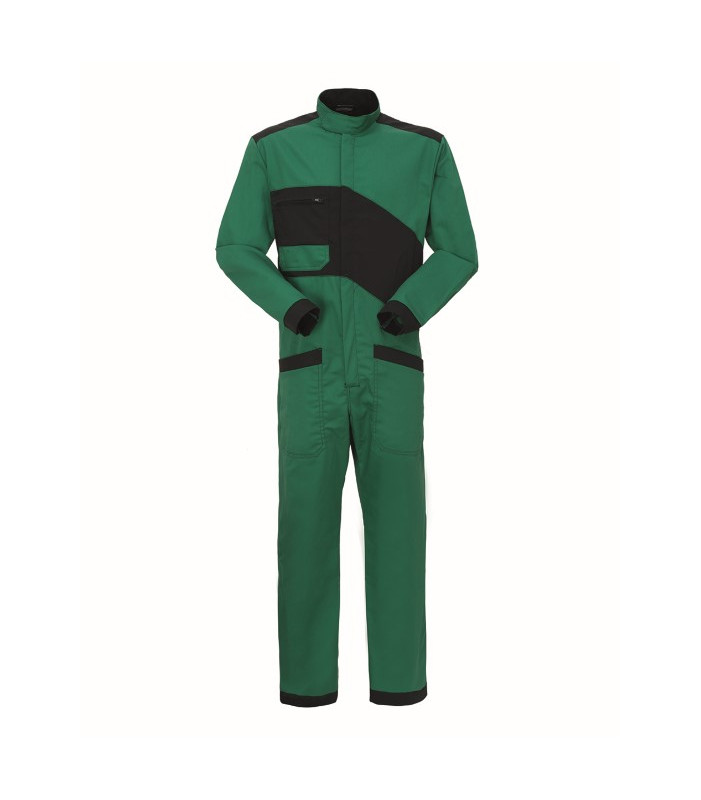 Chiusura con cerniera centrale coperta, collo alla coreana chiuso con velcro, 1 taschino applicato al petto destro chiuso con cerniera, 2 tasche inferiori applicate con profilo di colore a contrasto, elastico posteriore in vita, fondo manica dritto richiudibile con velcro, profilo di colore a contrasto al fondo gamba e manica, inserto in tessuto di colore a contrasto sul petto e sulle spalle. gabardine 65% poliestere 35% cotone, peso 245 g/m2