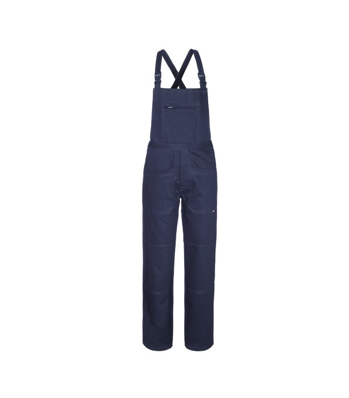 Chiusura alla patta con bottoni, apertura laterale a destra chiusa con bottone, 1 tascone applicato al petto chiuso con cerniera, 2 tasche anteriori applicate, portametro applicato su gamba destra, 1 tasca posteriore applicata a destra chiusa con bottone, bretelle incrociate in tessuto con elastico interno e fibbie in plastica, cuciture a contrasto di colore grigio 100% cotone, peso 340 g/m2. garzatura interna
