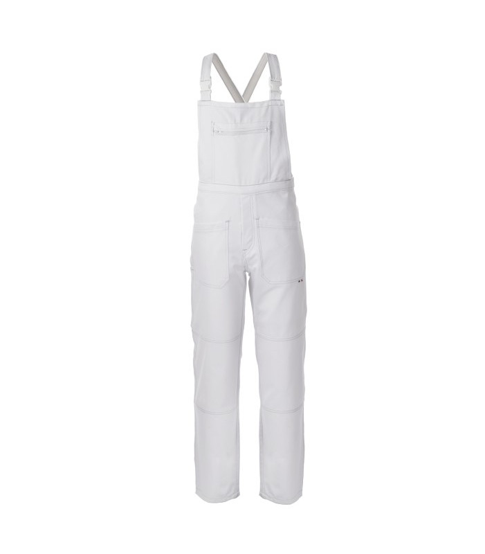 Chiusura alla patta con bottoni, 1 tascone al petto chiuso con cerniera, 2 tasche anteriori, 1 tasca posteriore chiusa con bottone, 1 porta metro su gamba destra, apertura laterale a destra chiusa con bottone, elastico in vita posteriore, bretelle incrociate con elastico interno e fibbie in plastica, cuciture di colore a contrasto drill 3/1, 100% cotone irrestringibile, 280 g/m2