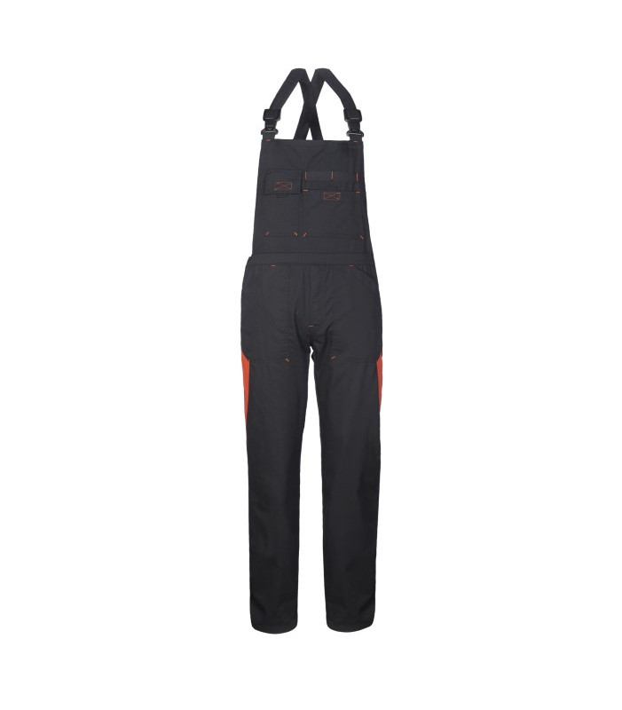 Chiusura alla patta con cerniera, 1 tascone e 1 portacellulare al petto, 2 tasche anteriori applicate, 1 tasca posteriore applicata a destra chiusa con aletta e velcro, 1 porta metro su gamba destra, elastico in vita posteriore, apertura laterale a destra chiusa con bottoni, salva reni e bretelle con elastico interno, inserti e travettature di colore a contrasto. 60% cotone 40% poliestere peso 245 g/m2