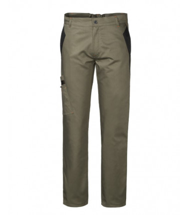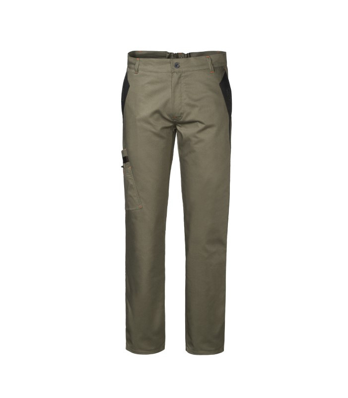 Chiusura alla patta con cerniera e bottone in cintura, 2 tasche anteriori interne, doppia tasca su gamba destra leggermente inclinata per facilitare l'ingresso, 1 tasca posteriore chiusa con aletta e velcro, elastico in vita posteriore, inserti e travettature di colore a contrasto. 60% cotone 40% poliestere peso 245 g/m2