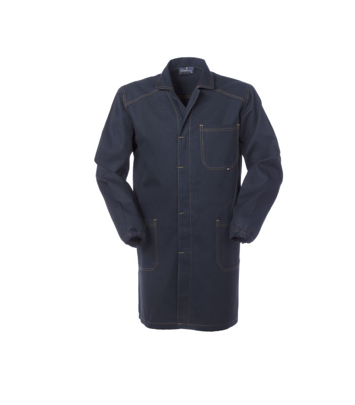Chiusura anteriore con bottoni coperti, 1 taschino al petto e 2 tasche inferiori, polsi con elastico, cuciture di colore a contrasto drill 3/1, 100% cotone irrestringibile, 280 g/m2