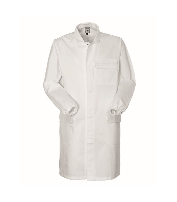 Chiusura anteriore con bottoni automatici coperti, 1 taschino applicato al petto sinistro chiuso con aletta e striscia velcro, 2 tasche inferiori applicate chiuse con aletta e striscia velcro, elastico ai polsi, spacco posteriore al fondo antiacido drill 2/1 20/20, 65% poliestere 35% cotone, peso 200 g/m2