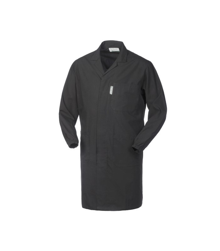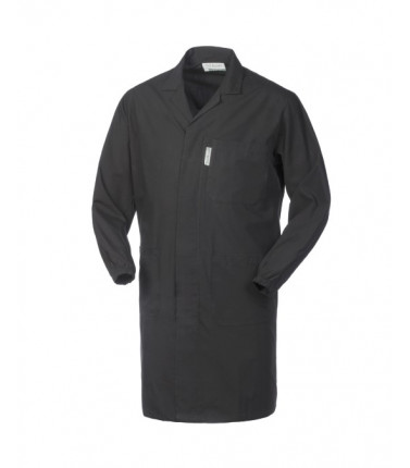 Chiusura centrale con bottoni coperti, collo aperto, due tasche e un taschino applicati, schiena intera, senza martingala, elastico ai polsi popeline, 65% poliestere, 35% cotone irrestringibile, peso 145 g/m2