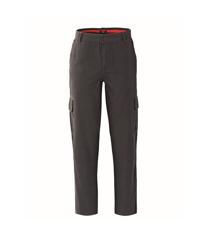 Chiusura alla patta con cerniera e bottone in cintura, 2 tasche anteriori interne con cucitura di colore rosso, elastico ai fianchi interno regolabile, 2 tasconi laterali con soffietto centrale chiusi con aletta e punti velcro, 1 tasca posteriore applicata a destra chiusa con aletta e punti velcro, 1 tasca posteriore applicata a sinistra chiusa con bottone tradizionale, travette varie di colore rosso. 100% cotone canvas, peso 210 g/m2