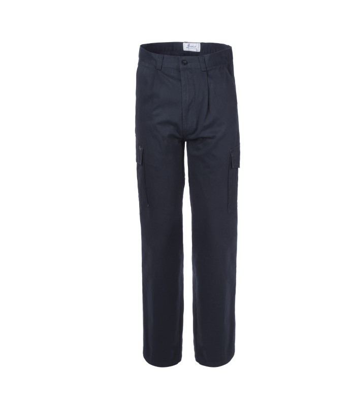 Chiusura alla patta con cerniera e bottone in cintura, 2 tasche anteriori interne, 2 tasche posteriori interne a filetto chiuse con aletta e punto velcro, 2 tasconi applicati alle cosce con soffietto laterale e centrale chiusi con aletta e punto velcro, cuciture due aghi con filo in poliestere cotone. 100% cotone gabardine peso 260 g/m2