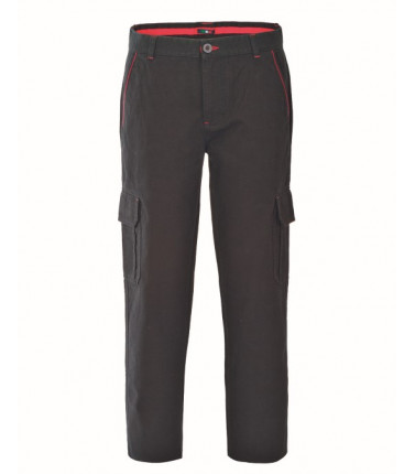 100% cotone twill peso 330 g/m2 chiusura alla patta con cerniera e bottone in cintura, 2 tasche anteriori interne con cucitura di colore rosso, elastico ai fianchi interno regolabile, 2 tasconi laterali con soffietto centrale chiusi con aletta e punti velcro, 1 tasca posteriore applicata a destra chiusa con aletta e punti velcro, 1 tasca posteriore applicata a sinistra chiusa con bottone tradizionale, travette varie di colore rosso