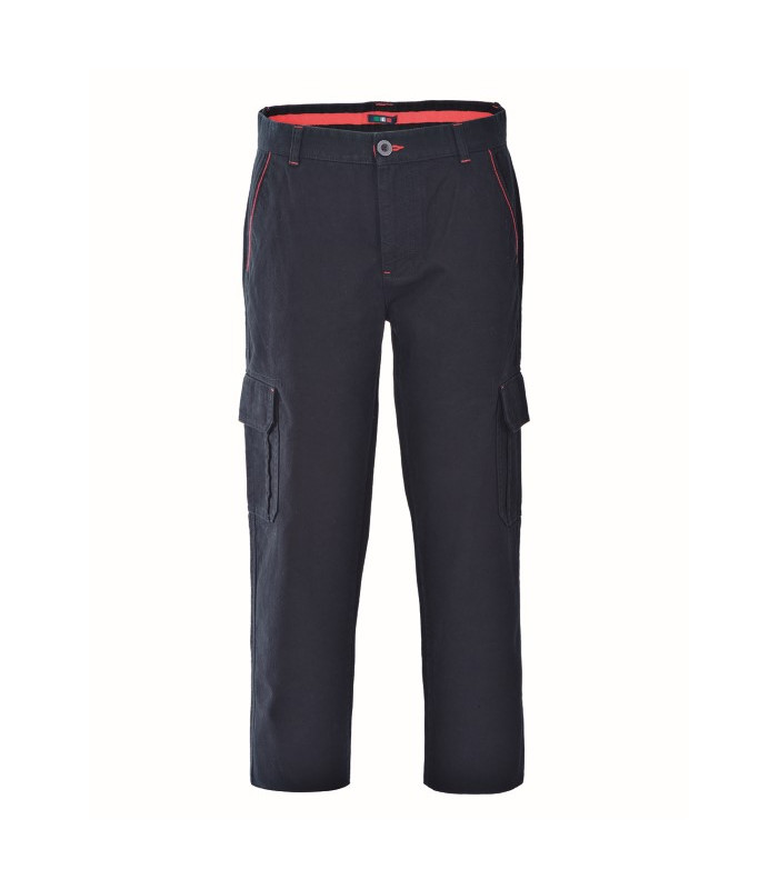 100% cotone twill peso 330 g/m2 chiusura alla patta con cerniera e bottone in cintura, 2 tasche anteriori interne con cucitura di colore rosso, elastico ai fianchi interno regolabile, 2 tasconi laterali con soffietto centrale chiusi con aletta e punti velcro, 1 tasca posteriore applicata a destra chiusa con aletta e punti velcro, 1 tasca posteriore applicata a sinistra chiusa con bottone tradizionale, travette varie di colore rosso
