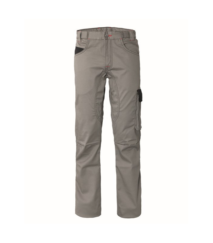 Chiusura alla patta con cerniera e bottone in cintura, 2 tasche anteriori interne e 1 piccolo taschino di colore a contrasto a destra, 2 tasche posteriori applicate chiuse con aletta e punto velcro, 1 tascone applicato su gamba sinistra con soffietti laterali chiuso con aletta e punto velcro, 1 tasca multifunzione applicata su gamba destra, pences alle ginocchia per maggiore confort, elastico interno in vita anteriore, travettature varie di colore rosso. 64% cotone 34%poliestere 2% elastane, peso 260 g/m2 tintura indanthrene